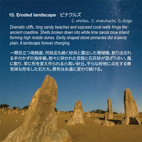Dramatic cliffs, long sandy beaches and exposed coral reefs fringe the ancient coastline. Shells broken down into white lime sands blow inland forming high mobile dunes. Eerily shaped stone pinnacles dot a sandy plain. A landscape forever changing.