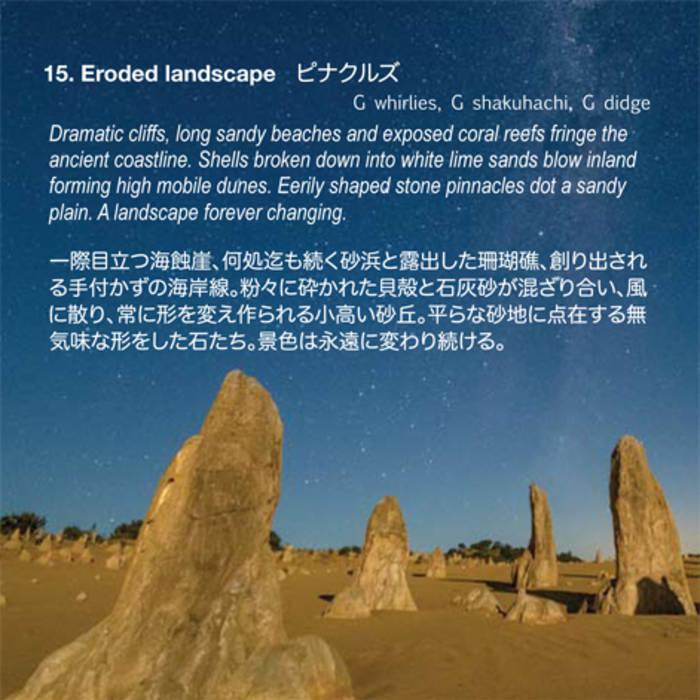 一際目立つ海蝕崖、何処迄も続く砂浜と露出した珊瑚礁、創り出される手付かずの海岸線。粉々に砕かれた貝殻と石灰砂が混ざり合い、風に散り、常に形を変え作られる小高い砂丘。平らな砂地に点在する無気味な形をした石たち。景色は永遠に変わり続ける。